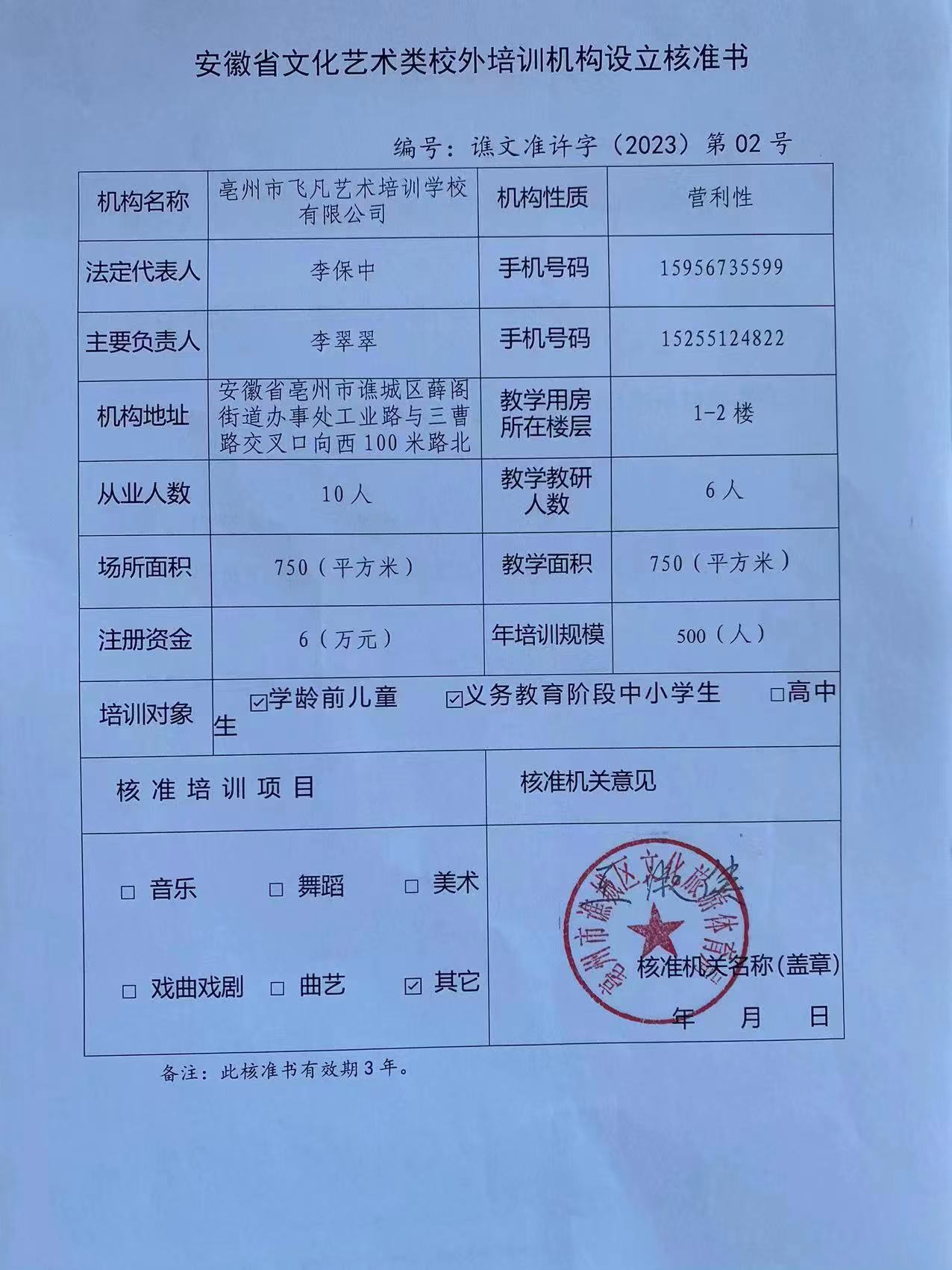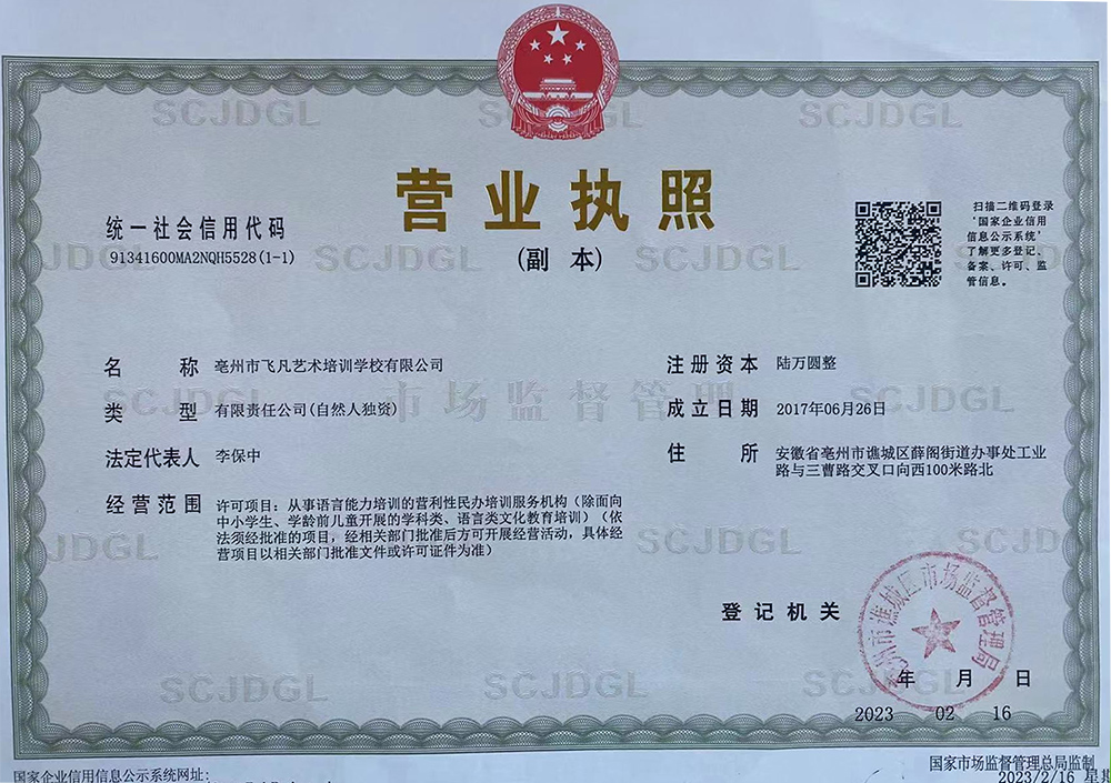 亳州市飛凡藝術(shù)培訓(xùn)學(xué)校有限公司開(kāi)設(shè)有播音主持、演講朗誦、戲劇表演、社交禮儀、情商口才、舞臺(tái)形體、國(guó)學(xué)啟智課程,在全市擁有兩家校區(qū),校區(qū)面積近2000平方,本著“讓每一個(gè)孩子更自信”的教學(xué)理念,2022年經(jīng)亳州市市場(chǎng)監(jiān)督管理局、文化體育旅游局正式審批機(jī)構(gòu)。已為全市培養(yǎng)近兩千名優(yōu)秀青少年兒童。 多年來(lái)以培養(yǎng)廣大少年兒童創(chuàng)新意識(shí)和實(shí)踐能力為宗旨,突出口才特色,積極開(kāi)展社會(huì)實(shí)踐活動(dòng),每年都涌現(xiàn)出了許多優(yōu)秀...